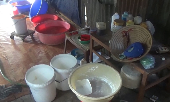 Qua khám xét, Công an phát hiện 540kg tương ớt, 125kg tương đen thành phẩm được đựng trong các can nhựa loại 5 lít, 38kg tương hột xay, 130kg tương hột, 570kg tương đang ủ chưa thành phẩm, 155kg bột bắp và 10 loại hóa chất dùng để xản xuất gồm: Chất tạo màu, tạo hương, chất làm chua, làm cay, chất bảo quản. Trong đó, có 9 loại hóa chất không có nhãn mác, nguồn gốc xuất xứ.