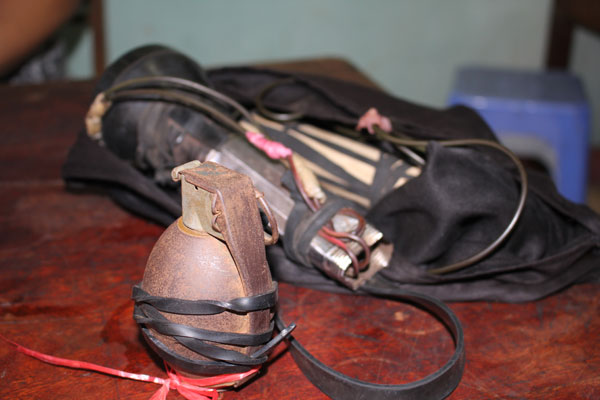 | Quả lựu đạn mỏ vịt Giàng thủ sẵn trong túi nải. |
