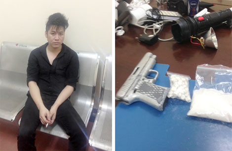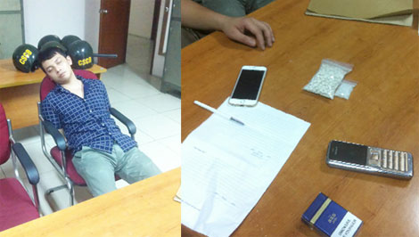 | Đối tượng Dương Ngọc Hoàng tại Cơ quan Công an (ảnh trái). Tang vật thu giữ của Dương Ngọc Hoàng và Tạ Văn Tiến tại Cơ quan Công an. |