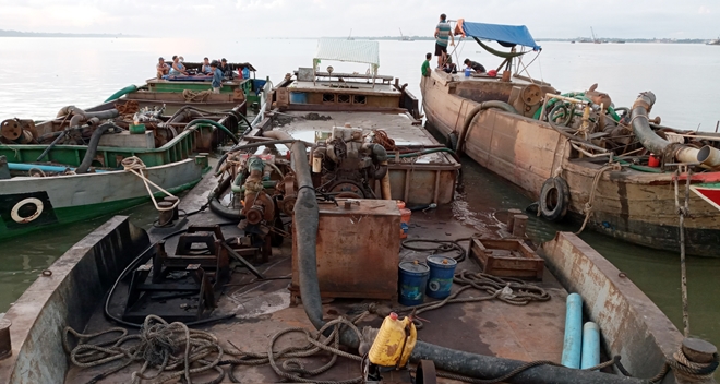 | Các phương tiện khai thác cát trái phép trên sông Cổ Chiên bị lực lượng chức năng bắt quả tang. |