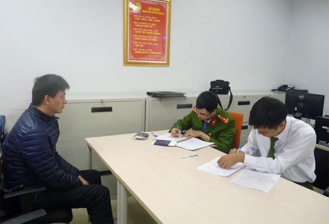 | Đối tượng truy nã Chen Hai Bin (trái) khai báo tại cơ quan Công an Việt Nam. |