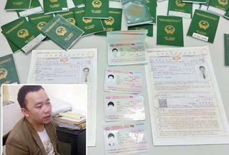 | Bị can Huy và những giấy tờ giả mạo để lừa đảo người lao động. |