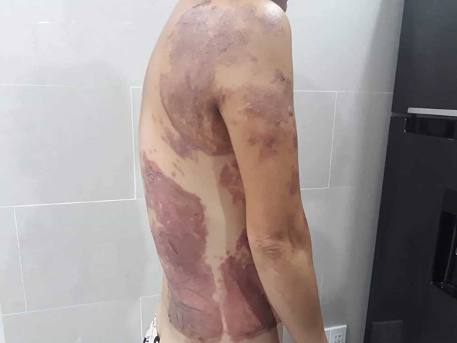 | Bà Ly bị bỏng nặng do bị hắt nguyên chảo dầu ăn vào người |