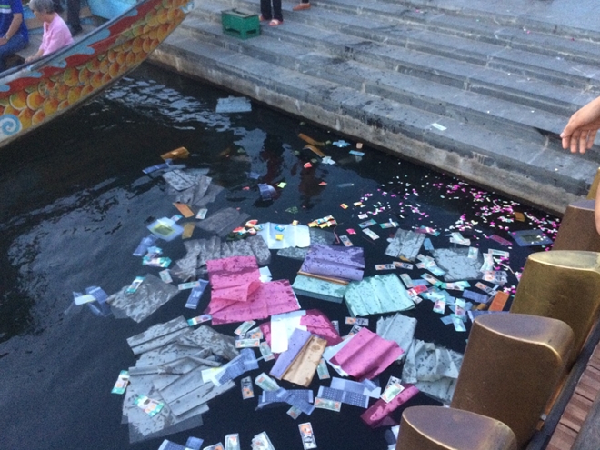 | Vàng mã được ông Xưng ném xuống sông Hương, gây ô nhiễm môi trường khiến du khách bức xúc. |