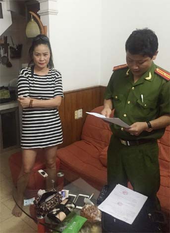 | Cán bộ Cục Cảnh sát hình sự đọc lệnh bắt, khám xét khẩn cấp đối với Trần Thị Hương Giang. |