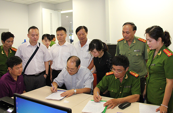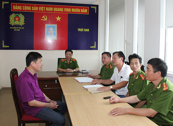 | Thiếu tướng Nguyễn Dĩnh, Cục trưởng Cục Cảnh sát truy nã tội phạm chỉ đạo cán bộ lấy lời khai đối tượng truy nã quốc tế Yin Wen Sheng (đối tượng mặc áo phông tím). |