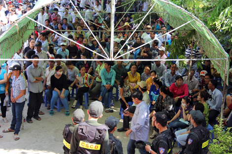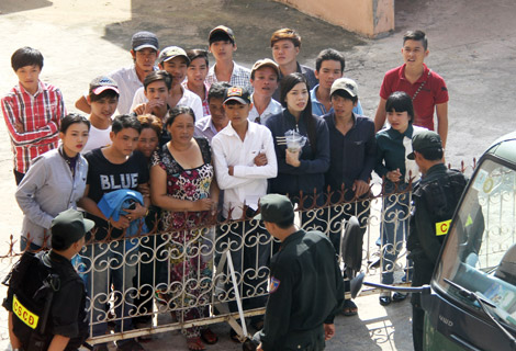 | Cả trăm người dân là thân nhân các bị cáo, trước khu vực tòa xét xử. |