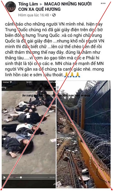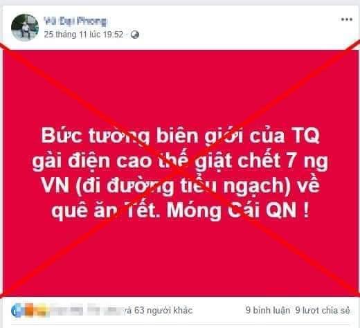 Cụ thể thông tin xuất hiện trên mạng xã hội với nội dung “Bức tường biên giới của TQ gài điện cao thế giật chết 7 người VN (đi đường tiểu ngạch) về quê ăn Tết. Móng Cái QN !”. Ngay sau đó các cơ quan chức năng và chính quyền TP Móng Cái (tỉnh Quảng Ninh) đã xác minh làm rõ và khẳng định đây là thông tin sai sự thật. Thông tin trên được các đối tượng xấu tung lên, nhằm gây mất trật tự an ninh xã hội. Các hình ảnh phát tán trên mạng xã hội kèm thông tin này cũng được xác định là hình ảnh cắt ghép.
