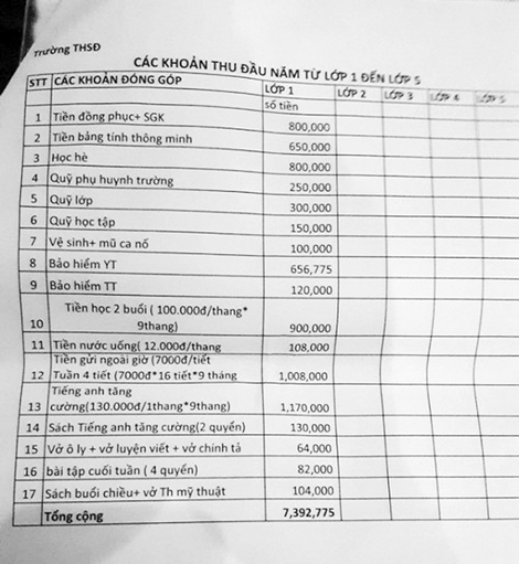 Theo một phụ huynh cho biết: "Các khoản thu năm nay được giáo viên chủ nhiệm phát đến tay chúng tôi gồm: tiền học hè 800.000 đồng, tiền bảng tính thông minh 650.000 đồng, tiền tiếng Anh tăng cường 1.170.000 đồng, quỹ phụ huynh trường 250.000 đồng, quỹ lớp 300.000 đồng, quỹ học tập 150.000 đồng… Tổng cộng là gần 8 triệu đồng. Chúng tôi đa phần là nông dân thì xoay ra đâu từng đó tiền để đóng cho con. Hơn nữa, dù có đủ khả năng đóng thì cũng phải là những khoản thu mà chúng tôi thấy hợp lý chứ không thể theo kiểu nhà trường thích thu bao nhiêu là được bấy nhiêu".