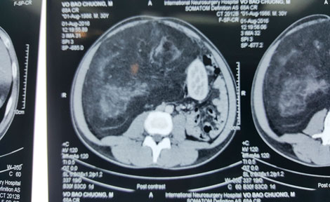 Theo bác sĩ của BV Ung bướu, bà N. bị bướu sau phúc mạc, bướu chiếm trọn ổ bụng. Do bướu lớn nên đã đẩy thận trái lên cao và sang phải, thận trái đã bị ứ nước độ III. Kết quả CT thấy bướu cấu trúc hỗn hợp có thành phần mô không đồng nhất, bắt thuốc cản quang không đều. Cực dưới bướu xuống sát trước đáy bàng quang, kích thước 260 x 330mm…