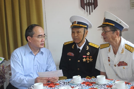 | Đồng chí Nguyễn Thiện Nhân trò chuyện với cựu thuyền trưởng Năm Phước (giữa) và cựu thủy thủ tàu không số. |