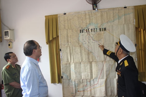 | Thuyền trưởng Năm Phước kể lại chuyến vượt biển vào Nam trên bản đồ. |