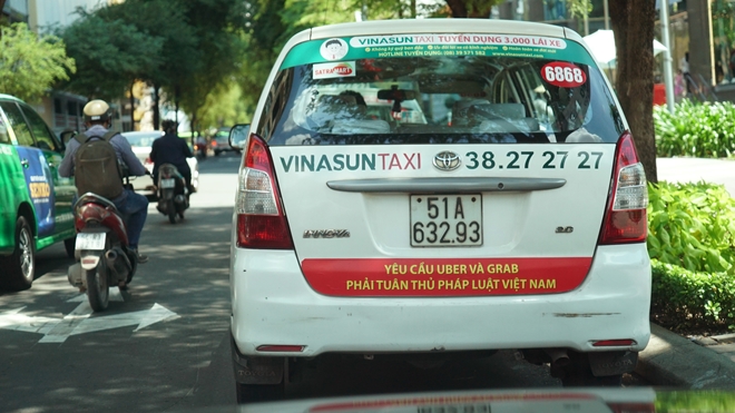 Trong khi những tin tức tốt đẹp về văn hóa kinh doanh xem khách hàng là Thượng đế của cây xăng Nhật đang làm nức lòng người tiêu thụ, thì vào ngày 8-10, người đi đường bắt gặp một hình ảnh “đau mắt" của Hãng taxi Vinasun khi các xe taxi dán đầy dòng chữ với nội dung: "Yêu cầu Uber và Grab phải tuân thủ pháp luật Việt Nam" và “Đề nghị dừng thí điểm Grab và Uber vì quá nhiều bất công về điều kiện kinh doanh”.