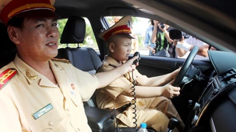 Ngồi trên xe CSGT dẫn đường, giọng Tuấn Dũng dõng dạc: “Hôm nay con đến đây là để tuyên truyền với tất cả mọi người về luật An toàn giao thông. Theo luật giao thông đường bộ, người ngồi trên xe mô tô, xe gắn máy và kể cả xe máy điện phải đội mũ bảo hiểm và cài quai theo quy cách… Người tham gia giao thông không được vượt đèn đỏ, không được đi ngược chiều... Cuối cùng con kính chúc tất cả mọi người mạnh khỏe và tham gia giao thông an toàn”...