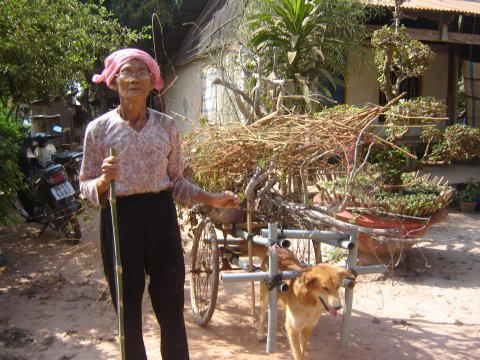 | Bà Cao Thị Mỹ bên chú chó chuẩn bị hành trình kéo xe ra chợ. Ảnh: sưu tầm |