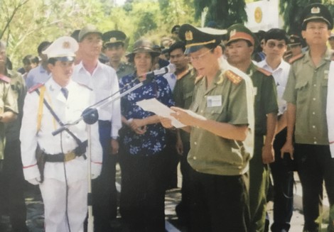 | Đại tá Huỳnh Minh Phụng, Phó Trưởng Ban Thường trực Ban chỉ đạo quy tập mộ liệt sĩ Bộ Công an đọc lời điếu tại lễ an táng hài cốt liệt sĩ năm 1999. |