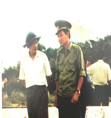 | Cố Bộ trưởng Bùi Thiện Ngộ (bên phải) và Đại tá Huỳnh Minh Phụng tại nghĩa trang Ban An ninh Trung ương Cục miền Nam ngày 27-7-1995. |