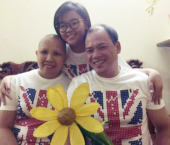 | Dù mắc bệnh hiểm nghèo nhưng chị Cẩm Bào vẫn thấy mình may mắn vì có chồng và con luôn ở bên |