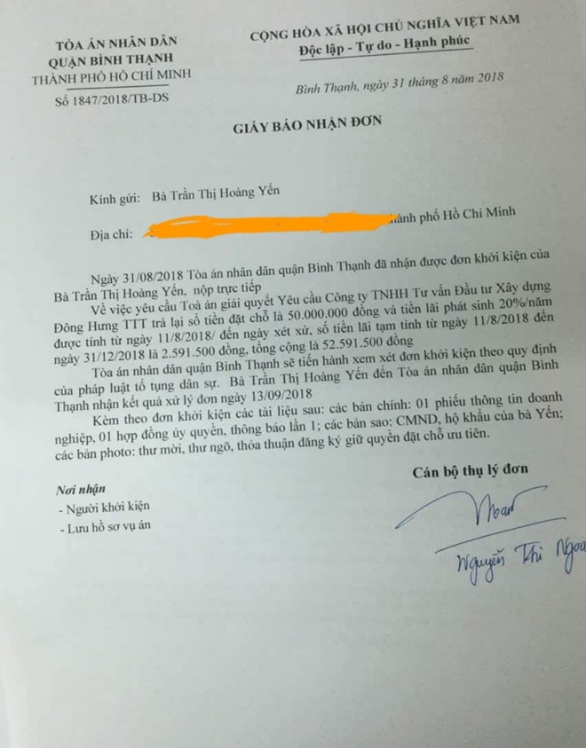 Đến nay, chị Trần Thị Hoàng Yến đã kiện Đông Hưng Group ra TAND quận Bình Thạnh yêu cầu công ty này phải trả thêm số tiền lãi phát sinh do công ty đã vi phạm thỏa thuận với tôi với lãi suất 20%/năm được tính từ ngày 11-8-2018 cho đến khi tòa án xét xử. Số tiền lãi tạm tính từ ngày 11-8 đến 31-12-2018 là 2.591.500 đồng. Như vậy, tổng số tiền chị Yến đòi Đông Hưng Group phải trả đến ngày 31-12-2018 là 52.591.500 đồng.