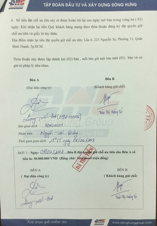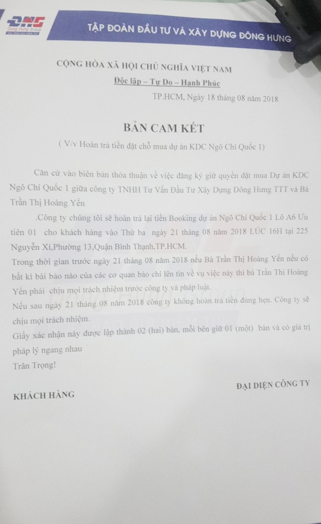 Tuy nhiên, 3 ngày sau khi mở bán, phía công ty báo cho chị Yến lô A6 đã có người mua và công ty không có tiền để trả cho chị. Bức xúc trước cách làm ăn không giữ chữ tín của công ty, nên ngày 5-6-2018 chị Yến đã viết thư thông báo cho công ty về việc công ty đã vi phạm hợp đồng. Đến ngày 8-6, chị nhận được thông báo của Đông Hưng Group về việc dời ngày trả tiền đặt chỗ. Tuy nhiên, văn bản thông báo lại không được đóng dấu và không có chữ ký của Ban giám đốc công ty.