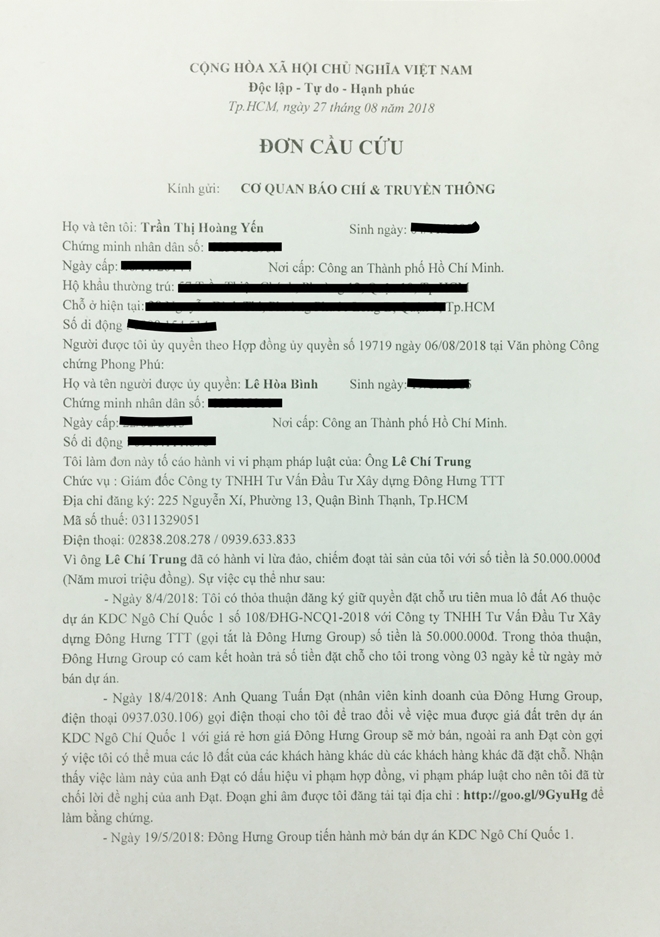 | Đơn cầu cứu khách hàng gửi đến cơ quan báo chí cầu cứu và cảnh báo về dấu hiệu hành vi của Đông Hưng Group |