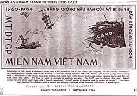 | Tàu USNS CARD dài 151m, công suất 8.500 mã lực. (Ảnh tư liệu) Con tem in sự kiện đánh đắm tàu chiến Mỹ. |