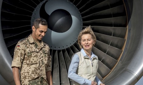 | Bộ trưởng Quốc phòng Ursula von der Leyen đứng cạnh một quân nhân Đức khi bà tới căn cứ không quân Azraq ở Jordan vào đầu năm 2018. |