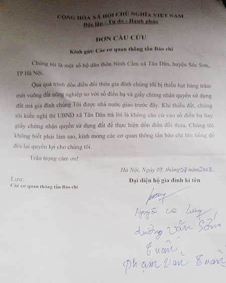| Đơn kêu cứu của một số hộ dân mất đất ở Tân Dân. |