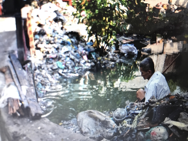 Ông dẫn chúng tôi ra xem khu vực trong và ngoài dòng kênh. Nước đen và đục dính bệt vào nhau lắng chặt xuống dưới đáy kênh. Rác từ trên thượng nguồn không hiểu do ai, tại ai mà mỗi ngày nó chảy qua dòng kênh gây ứ đọng làm nước không thông được.