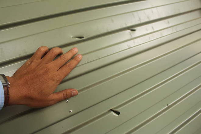 | Cửa cuốn nhà chị Huế bị kẻ xấu dùng kiếm đâm nhiều nhát. |