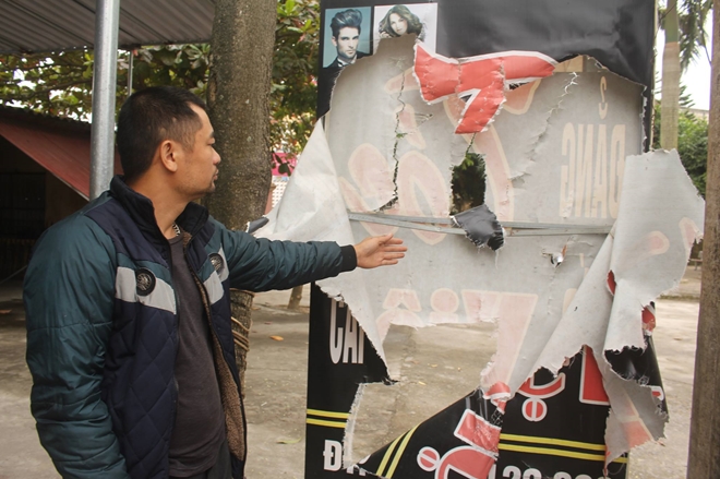 Về đến nơi, anh Duyên thấy vợ con hoảng loạn, sợ hãi và lúc này công an xã đang có mặt tại đây, cửa nhà đã mở và cạnh đó có nhiều mảnh kính vỡ vương vãi khắp nơi. Đặc biệt, 5 biển hiệu quảng cáo quán cắt tóc bị chém rách, trên cửa cuốn có hơn 10 vết kiếm đâm, cửa bị cong vênh, bóng điện phía ngoài bị đập vỡ và bàn ghế ở ngoài cũng bị chém gãy.