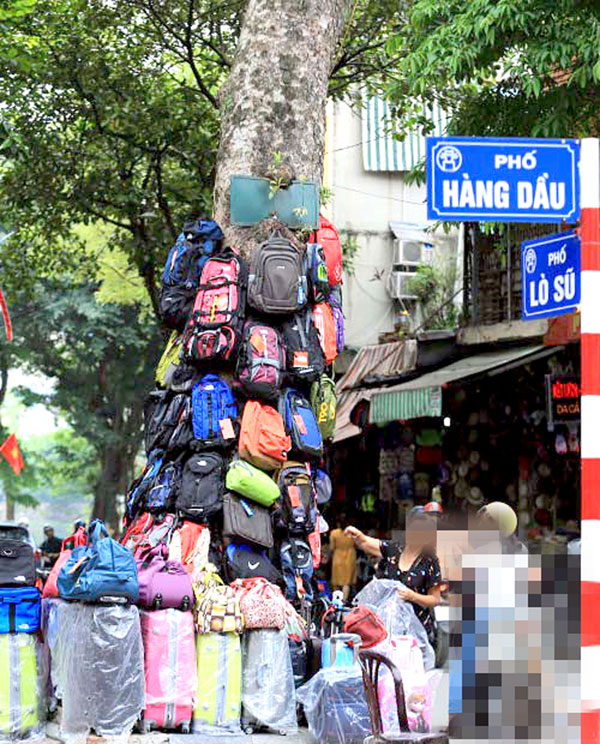 Trước một cửa hàng bán cây cảnh ở đường Hoàng Hoa Thám, đinh được đóng lên thân cây để treo các chậu hoa cảnh lủng lẳng. Tại phố Lò Sũ một cửa hàng bán túi xách, va li và ba lô thản nhiên đóng hàng trăm cái đinh để treo đồ lên bán. Nhìn cây cổ thụ “còng lưng” đeo gần một trăm chiếc ba lô, từ gốc lên đến gần nửa thân cây, đến nỗi mỗi khi có khách mua, người bán hàng phải lấy chiếc gậy móc dài chừng 3m để đưa đồ xuống, ai nấy đều cảm thấy ái ngại!