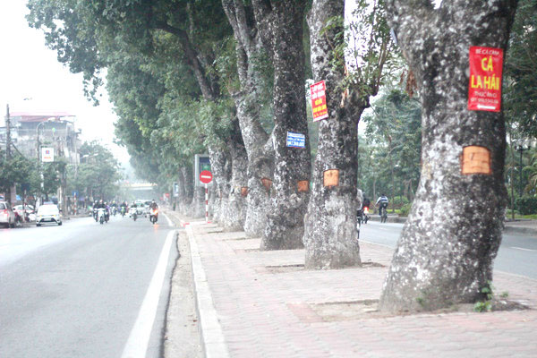 Không chỉ lột vỏ, chém, chặt mà một số người dân thiếu ý thức còn đóng đinh vào thân cây rồi treo biển quảng cáo, rao vặt, ba lô, túi xách… Thậm chí còn đóng cả những chiếc đinh thuyền lớn vào thân cây xanh để treo quạt điện, mắc võng nằm “vô tư” ngủ nơi vỉa hè!