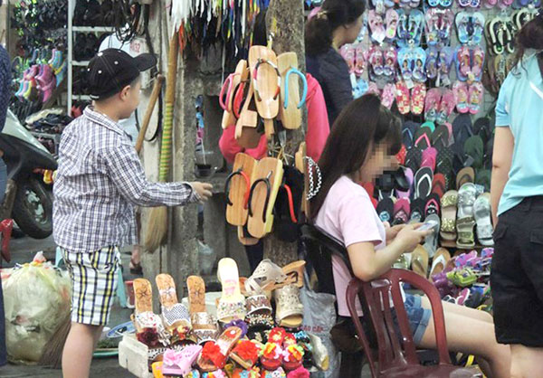 Và hàng loạt cây xanh bị một số quán nhậu quấn dây đèn điện chi chít để trang trí... Thậm chí, có người bán quần áo, giầy dép còn dùng đinh đóng cọc gỗ lên thân cây để làm dàn phơi bày đồ ngay lề đường.
