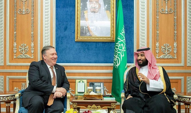 | Ngoại trưởng Mỹ Mike Pompeo thảo luận về vấn đề an ninh hàng hải Iran và Yemen với Thái tử Arab Saudi Mohammed bin Salman. Ảnh: AP. |