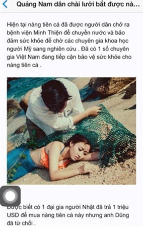 Độc quyền và đỉnh điểm hơn, chính tác giả bài viết này còn tung thêm thông tin "mật" về chuyện "nàng tiên cá" đã được một thương gia người Nhật ra giá 1 triệu đô la để đưa nàng về Nhật nghiên cứu. Tuy nhiên, anh ngư dân Việt một mực từ chối vì muốn để "nàng tiên cá" lại Việt Nam để các bác sĩ của bệnh viện Minh Thiện "chăm sóc".