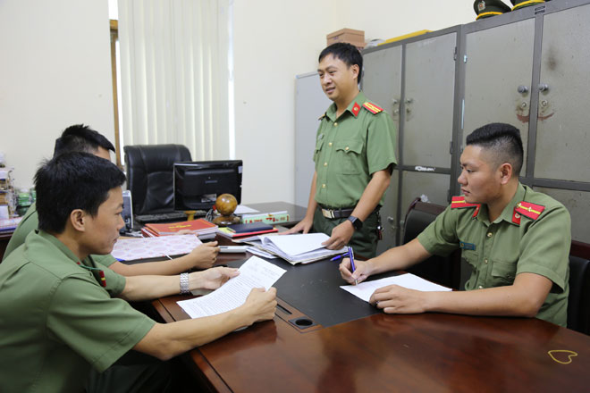 | Thiếu tá Từ Tú Phương trao đổi công tác nắm tình hình an ninh với cán bộ chiến sĩ. |