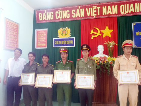 | Đại uý Đặng Quốc Bảo (thứ 3 từ phải sang) nhận giấy khen của UBND huyện Chư Păh. |