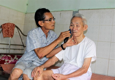 | Cụ ông Nguyễn Đốc (92 tuổi, quê Thăng Bình) được các cán bộ trung tâm chăm sóc. |