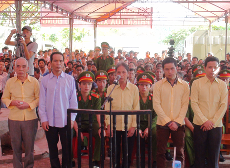 | Y Gyin và các đối tượng cầm đầu tà đạo Hà Mòn tại phiên tòa xét xử. |