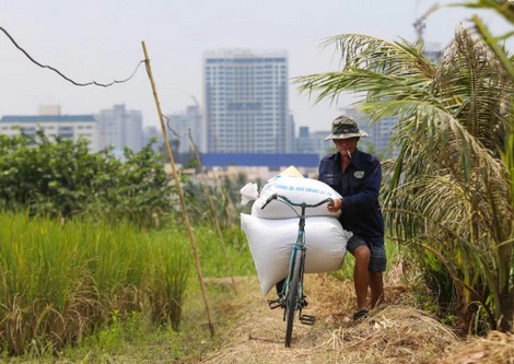 | Cư dân bán đảo Thanh Đa chở lúa từ cánh đồng về nhà. |