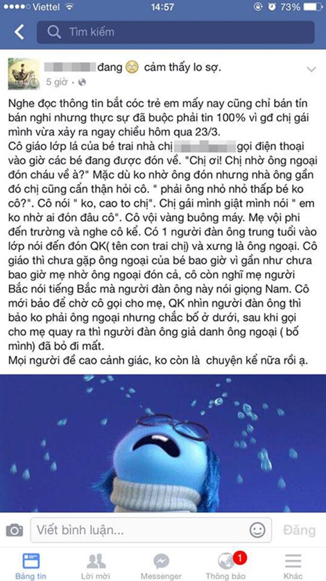 Ngày 24-3, trên "tường" của một người tên L.L chia sẻ "status" với giọng điệu khá nghiêm trọng như sau: "Nghe đọc thông tin bắt cóc trẻ em mấy ngày nay cũng chỉ bán tín bán nghi, nhưng thực sự đã buộc phải tin 100% vì gia đình chị gái mình vừa xảy ra chiều hôm 23-3-2016. Cô giáo lớp lá của bé trai nhà chị H.Q gọi điện thoại vào giờ các bé đang được đón về. "Chị ơi! Chị nhờ ông ngoại đón cháu về à?"…