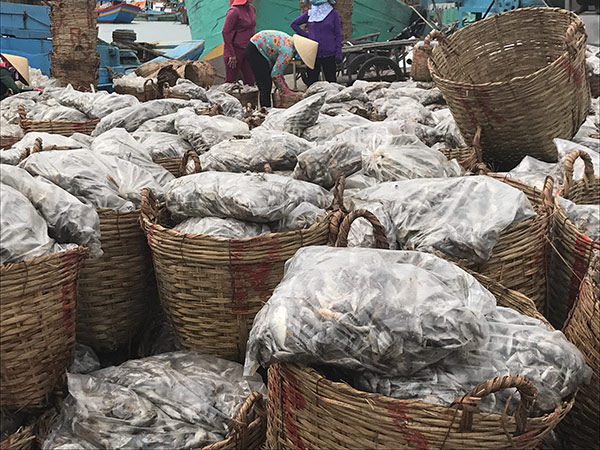 | Những thúng cá chờ xuất bến. |