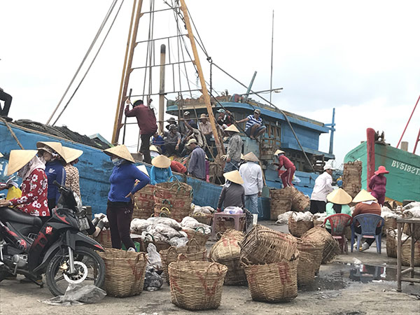 | Cảnh bốc dỡ tấp nập trên cảng cá khi tàu vào bờ. |