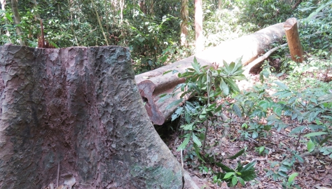 Theo con đường nhỏ phủ dày lá khô, chúng tôi bắt gặp một gốc cây lớn bị cắt bằng cưa xăng. Phần gốc còn lại chỉ cách mặt đất chừng hơn gang tay. Vết cắt mới, nhựa cây ứa ra đỏ ối. Người dẫn đường cho chúng tôi vốn là “thổ dân” vùng này nhìn gốc cây rồi bảo: “Đây chắc chắn là cây gõ rồi”.