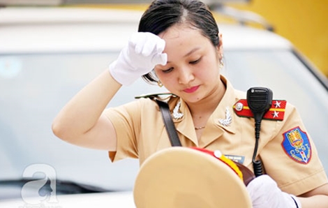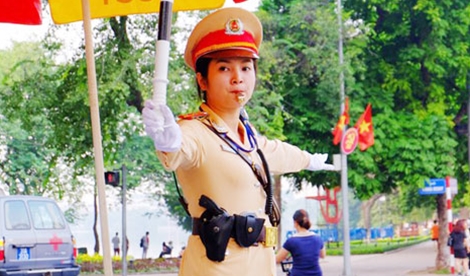 Tóc bết dính mồ hôi, nụ cười tươi rói trên khuân mặt xinh xắn, cùng bộ Cảnh phục mang mầu nắng, khiến lòng người đi đường như dịu lại, sau những bận bịu toan lo công việc của một ngày. Đó thực sự là một hình ảnh đẹp và gần gũi tại nơi trái tim của Thủ đô.