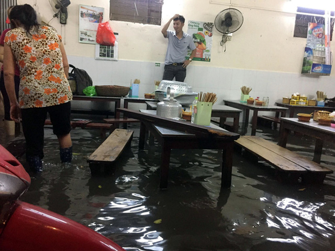 Nước ngập vỉa hè đường Lý Tự Trọng. |