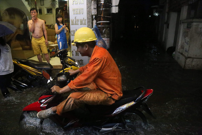 | Đường ngập đã làm nhiều phương tiện bị chết máy, người dân phải khó nhọc dắt xe dầm mình trong mưa lớn. |