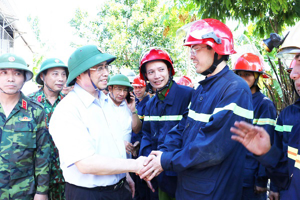 | Ông Phạm Minh Chính - Uỷ viên Bộ Chính trị, Bí thư Trung ương Đảng, Trưởng Ban Tổ chức Trung ương thăm hỏi, động viên lực lượng tham gia chữa cháy. |