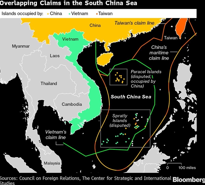 | Bản đồ Biển Đông với các tuyên bố chủ quyền chồng lấn. |